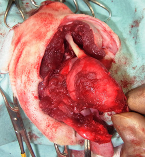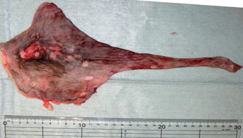 線維肉腫: 乳腺部に発生した線維肉腫が破裂し、痛みを伴っていた症例