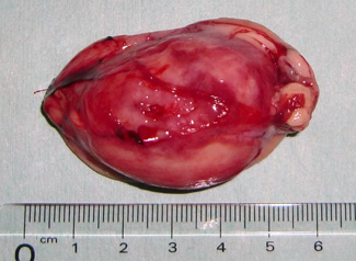 左の精巣が腹腔内の精巣腫瘍。 右の精巣が本来の位置に残されていた精巣 |